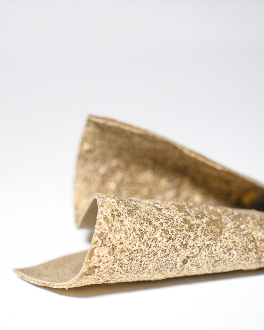 Produced in a studio combining materials science and craftsmanship, the ingredients are mixed while researchers monitor variables such as temperature and pH. The refined material can then be molded, spread into sheets, laser-cut, embroidered, or sawn using conventional fabrication tools.