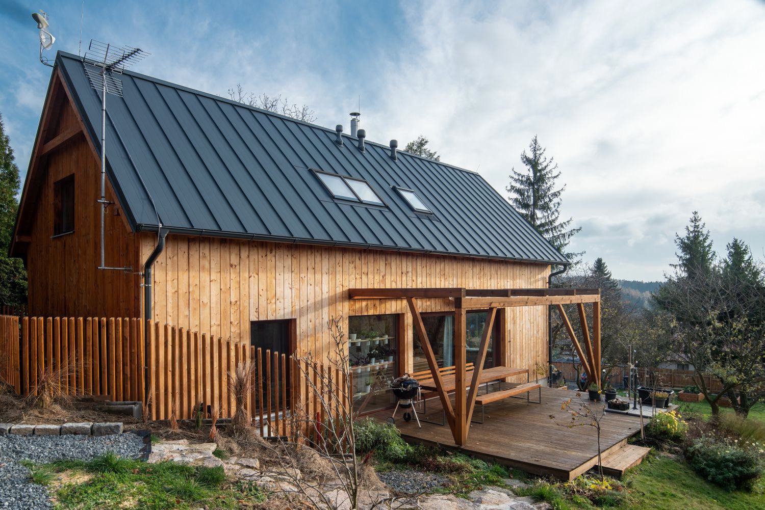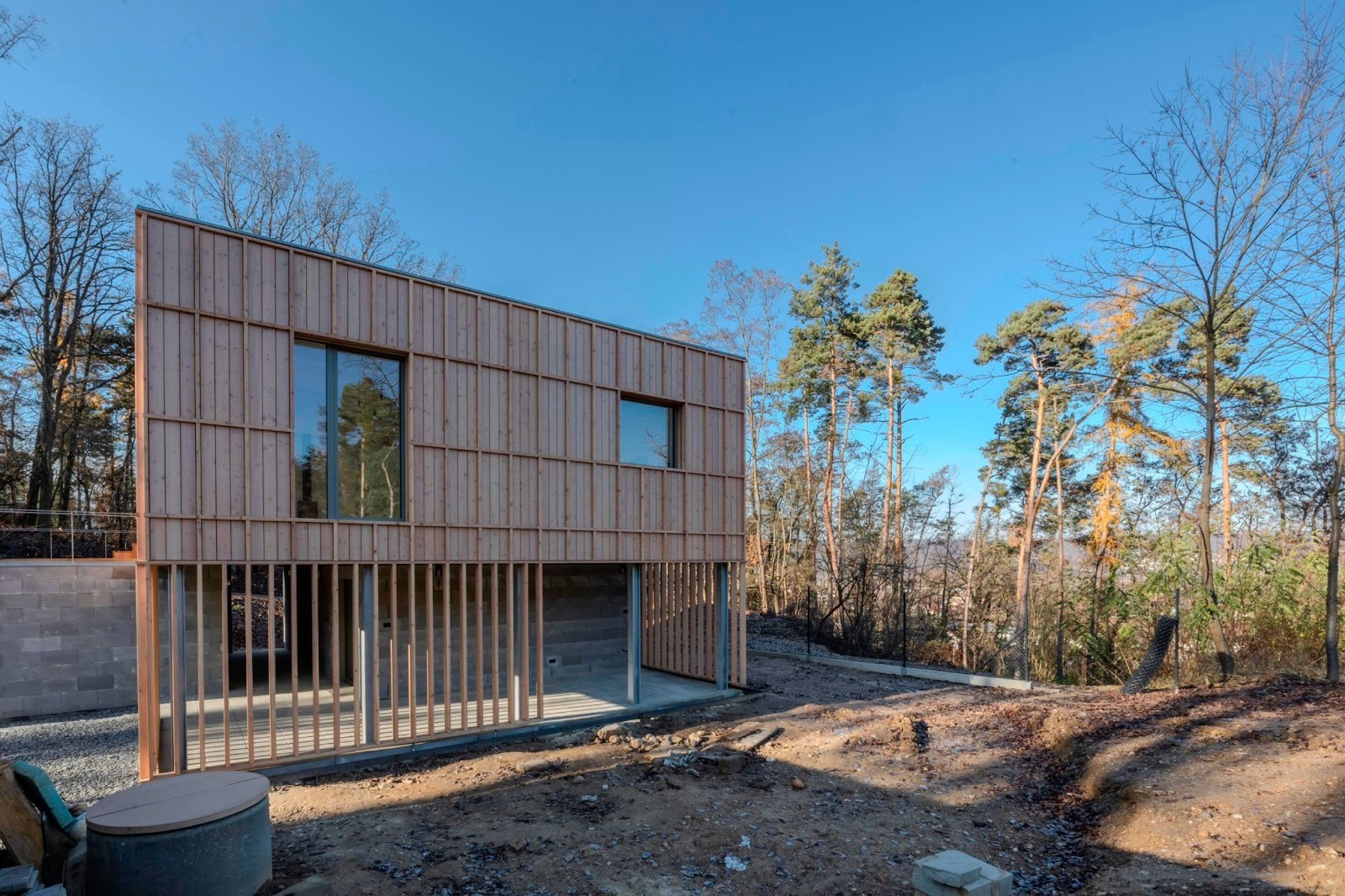 This single-storey detached house with a habitable attic has a built-up area of 93 sqm. After developing numerous layout variants themselves, the owners commissioned OTA ateliér to refine the architectural concept, following the typology of a traditional gabled house located near the forest. The structure is built as a timber frame incorporating compressed straw boards within the wall assembly. A ventilated timber façade completes the exterior envelope.