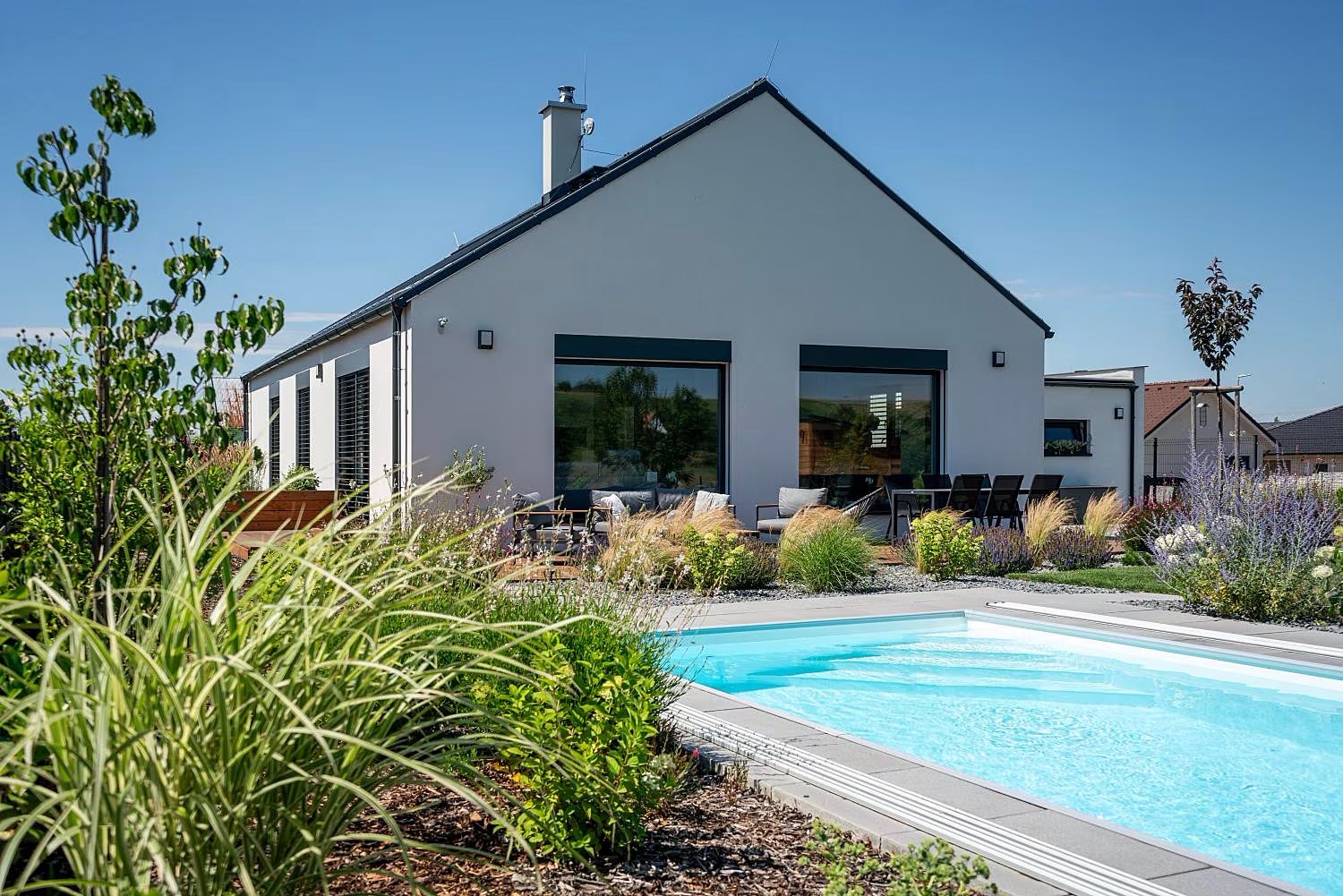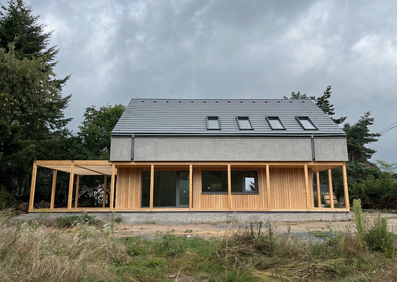 This 140 sqm single-family wooden house was designed according to the standard ALFA 140 model and later adapted to the client’s needs. Located in eastern Czech Republic, it was built with a lightweight timber frame and the diffusion-open EKO2 wall system. The wall achieves a U-value of 0.19 W/m²K, and the house is classified as energy class A under Czech regulations.