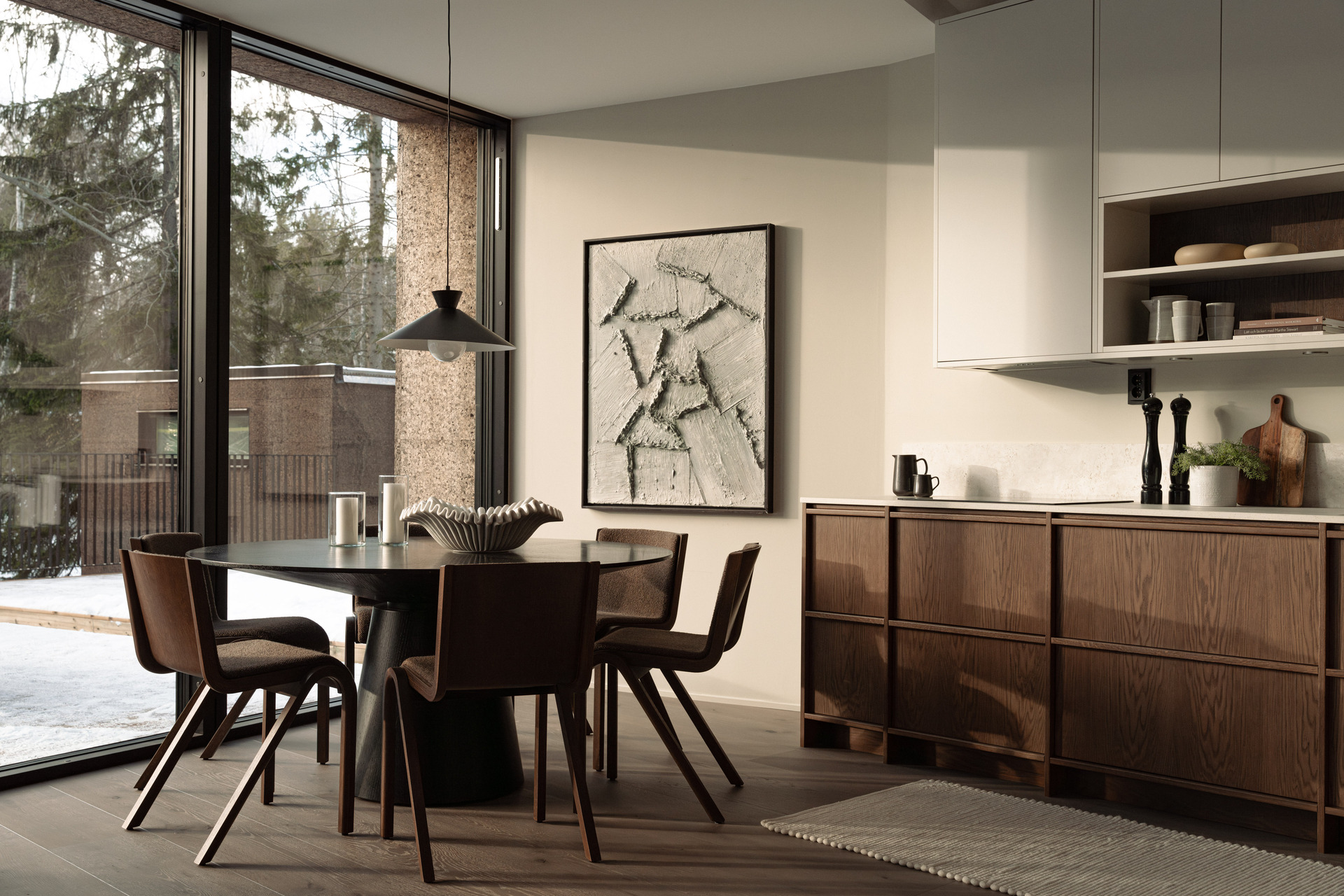 In this project, the facade is composed of a series of asymmetrical volumes, where cork is combined with timber cladding charred in situ using the Japanese shou sugi ban method, along with lightweight metal railings. In this way, the material reinforces the project’s relationship with its surroundings. Its matte surface and irregular texture evoke tree bark, allowing the buildings to blend more naturally into the wooded landscape. As architect Maria Ader of ELITHUS explains, the intention was not to compete with nature, but to work with materials that harmonize with the austere and rugged character of the Stockholm archipelago.